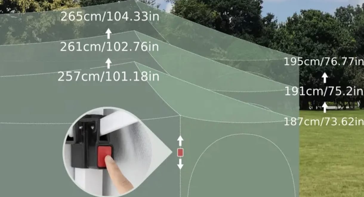 Sistema de altura regulable en 3 posiciones (máx. 265 cm en el pico – 195 cm lateral)
